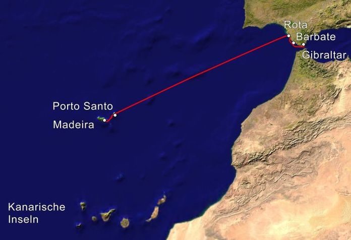 Nach knapp drei langen Wochen in La Linea, der spanischen Grenzstadt bei Gibraltar, ging es mit neuer Crew Sabrina aus Deutschland endlich weiter in den Atlantik. Die Winde ließen vorerst eine Fahrt durch die Straße von Gibraltar mit anschließenden Stopps in den spanischen Häfen Barbate und Rota zu. Letzteres ist ein angenehmer Liegeplatz, die nahe Altstadt ist sehenswert. Drei Tage dort zu verbringen um auf das richtige Wetter für die 540 Meilen lange Überfahrt zu warten, machte uns gar nichts aus. Mit von der Partie waren nämlich auch die Schweizer Silvia und Ulrich von der Segelyacht Harmonie, die wir in La Linea kennen gelernt hatten und die mit uns gemeinsam unterwegs waren, wenngleich auch mit ihrem sportlichen 13 Meter langen Aluminiumschiff deutlich schneller und daher immer vor uns im Hafen.