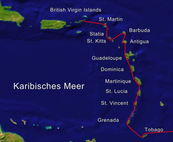 Die Tage auf Dominica waren wunderbar. In Roseau besichtigten wir mit einem Mietauto ein paar umliegende Sehenswürdigkeiten, und nach einer schönen, wellenfreien Segelei im Lee der Insel nach Norden warteten in Portsmouth noch einige Höhepunkte auf uns: Wasserfälle, Flussfahrt, Wanderungen im Regenwald, Baden in Flussbecken - all das zählte zu den besten Erlebnissen der bisherigen Reise. Unser nächstes Ziel war die zu Guadeloupe gehörende Inselgruppe Les Saintes, wo Benedicts Reise zu Ende war. Hier schien es kaum möglich einen brauchbaren Liegeplatz zu finden, da man nur an den vorhandenen Bojen festmachen bzw. außerhalb der Bojenfelder an relativ ungeschützten Plätzen in großen Tiefen ankern durfte. Da weit mehr Yachten als Bojen da waren, ergab das eine unbefriedigende Situation. Ich konnte zum Glück an einer privaten Boje eines Hotels festmachen, wenn auch an einer wenig geschützten Stelle. Daher waren die nächsten drei Tage des Abwetterns einer Starkwindperiode mit ausgiebigen Regenfällen eine unruhige, schauklige Angelegenheit. Immerhin lag ich hinter dem Schweizer Boot Harmonie mit Silvia und Ulli an Bord, mit denen ich gemeinsam von Gibraltar nach Madeira unterwegs war und die ich seit damals nicht mehr getroffen hatte. Die Bucht von Deshaies an der NW-Ecke von Guadeloupe war nach einem schönen Segeltag der nächste Ankerplatz und als Absprungpunkt Richtung Antigua vorgesehen. Wie an vielen anderen Orten auch, suchte ich dort eine Bar auf, um via WLAN zum Abrufen von Windinformationen und E-Mails ins Internet zu kommen. Mein als Konsumation übliches Cola kostete dort unglaubliche 4,50€! Das war Rekord. Sowas ist auf Flughäfen und auf Skihütten günstiger zu haben. Der Schock über den teuersten Wetterbericht aller Zeiten wurde im Laufe der zwei Tage dort durch den Verzehr etlicher wunderbar frischer, knuspriger Baguettes um je 1€ etwas gelindert. Die 40 Meilen Passage nach Antigua war eines der bisher schönsten Segelerlebnisse: Guter, kräftiger Wind, Sonnenschein, keine Regenfronten und nicht allzu hohe Atlantikwellen sorgten für eine schnelle und erquickliche Überfahrt. Der Anker fiel in Falmouth Harbour hinter dem Katamaran Dana de Mer mit Jage und Hope und ihren zwei Kindern Damon und Neyla an Bord, die ich schon auf den Kap Verden und in Tobago getroffen hatte. Wenige Tage vorher hatte das Schiff wegen eines gerissenen Wants (Drahtseil) seinen Mast verloren. Jetzt sitzt die Familie für die kommenden Monate bis zur Reparatur hier auf Antigua fest und der ursprüngliche Plan, nach Australien zu segeln und das Schiff dort zu verkaufen stand nun in Frage. Die zahlreichen Unterschiede zu den französischen Inseln fielen hier in einem Punkt besonders auf: In Martinique und Guadeloupe erledigt man die Ein- und Ausreiseformalitäten in einem Cafe durch Ausfüllen eines Formulars am dort bereit gestellten Computer, Kosten 0-4€, mit anschließendem Abstempeln durch den Wirten. Auf den anderen Inselstaaten ist das ungleich mühsamer: Der Kontrast war hier in Antigua besonders auffällig, da man im dafür zuständigen Büro neben einer Computereingabe mit zahlreichen (teilweise völlig unwichtigen) Schiffsdaten zwischen vier verschiedenen Instanzen (Customs, Immigration, Port Authority, Computerstation mit Anweisung) hin- und hergeschickt wird und es einige Zeit, viel Geduld und je nach Boots- und Besatzungsgröße 30-60€ kostet, bis man die nötigen Formalitäten erledigt hat. Besonders gut gefiel mir die von der Dame der Hafenbehörde liebevoll händisch geschriebene Rechnung mit fünf (!) verschiedenen zu bezahlenden Teilbeträgen (siehe Foto). Meine alte Freundin Klara kam hier an Bord und wir machten uns über diverse Zwischenstationen auf den Weg nach St. Martin. Höhepunkt war sicher der Aufenthalt auf der Insel Barbuda: Menschenleere Strände, hellblau-türkises Wasser, kaum andere Yachten und Sonnenschein. Nach jeweils einer Nacht am Spanish Point und in der Low Bay am 11-Mile-Beach segelten wir mit moderaten Winden unter Gennaker die 50 Seemeilen nach St. Kitts, wo wir nach einer ruhigen Nacht in der White House Bay in der winzigen Marina der Hauptstadt Basseterre dank der kleinen Anima und ihres geringen Tiefgangs noch einen angenehmen Platz bekamen - Die meisten anderen Yachten mussten vor dem Ort ungeschützt in der starken Dünung schaukelnd ankern. Welch ein Kontrast zu Barbuda: Riesige Kreuzfahrtschiffe mit tausenden von Leuten und dazu ein künstlich angelegtes Einkaufszentrum mit dem Parndorfer Outlet vergleichbar. Nach einer kurzen Inseltour a la Kreuzfahrttourist ging es tags darauf weiter zur Insel St. Eustatius (Statia). Dort gab es dann leider keine andere Möglichkeit als einen äußerst unruhigen Ankerplatz, um dann den ehemaligen Vulkan Quill zu erklimmen und in dessen von Regenwald bewachsenen Krater hinab zu steigen. Klaras Reise endete nach 10 kurzweiligen und abwechslungsreichen Tagen in St. Martin. Hier musste ich einige Zeit auf günstige Winde für die doch immerhin 80 Meilen lange Überfahrt zu den British Virgin Islands warten. In der Bucht von Marigot zwischen ca. 150 anderen Seglern traf ich wieder einmal Ute und Peter von der Hugin und auch Nadja und Manuel von der Manado, die ich seit den Kap Verden nicht mehr gesehen hatte. Daher vergingen diese fünf Tage auch wie im Flug. Für den 30.3. war guter Wind angesagt, die 80 Meilen zu den BVIs wurden mit Nachtfahrt absolviert. Von dort melde ich mich in ca. einem Monat wieder. |