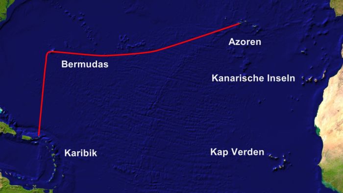 Da man nur 30 Tage auf den BVIs verweilen darf ohne extra 200US$ zahlen zu müssen, hatte ich Ende April ausklariert und bewegte mich im Mai bis zur Ankunft meiner Crew Michael am 7.5. möglichst unauffällig von einem Ankerplatz zum anderen. Zum Glück waren die Prognosen für ein Auslaufen am 8.5. relativ günstig, zumindest für die ersten Tage. Die Fahrt zu den Bermudas war insgesamt ganz okay, leider mussten wir fast die Hälfte der Zum Glück fand ich wie vor 13 Jahren am Somer´s Wharf einen Gratis-Liegeplatz. Michael konnte für den nächsten Tag einen Rückflug buchen, und so wartete ich fünf Tage auf das Eintreffen meines neuen Mitseglers, Herbert. In dieser Zeit waren wie üblich Inselbesichtigungen und kleinere Wartungsarbeiten am Programm. Zufällig hatte ich zweimal die Gelegenheit, bei einem einheimischen Tagestour-Skipper für Kreuzfahrtouristen als Deckshand mitzufahren. Neben den Eindrücken der Insel- und Buchtenwelt Bermudas bekam ich als Entlohnung drei Flaschen Rum! In der Hauptstadt Hamilton liefen die Vorbereitungen zum bald bevorstehenden America´s Cup. Als ich dort war fanden wegen Flaute leider keine Wettfahrten statt, so konnte ich die Rennmaschinen leider nicht live miterleben. Als ich vor 13 Jahren hier war, traf ich den hier ansässigen Österreicher und Restaurant-Besitzer Alfred. Mittlerweile hat er das bestbesuchte Lokal im Ort, und als ich ihn wieder besuchte, verwöhnte er mich mit steirischem Zirbenschnaps und Topfentorte. Am 23.5., zwei Tage nach Ankunft meines Mitseglers Herbert (Seefunkschule Koblmiller) liefen wir zur langen und wind- und wettermäßig mitunter schwierigen 1700 Meilen langen Fahrt zu den Azoren aus. Die Prognosen waren günstig für den Start und bis zum Abend des 29.5. segelten wir bei herrlichem Wetter und guten Geschwindigkeiten Richtung Osten. Dann mussten wir erstmals den Motor zu Hilfe nehmen und es folgten einige Tage mit schwachen, ungünstigen Winden immer wieder kurzen Regenfällen. Dank kräftiger Winde während der letzten zwei Tage mit flottem Segeln erreichten wir die Insel Flores am 6.6. kurz vor Dunkelheit und machten nach 14 Tagen und 8 Stunden glücklicherweise ohne Sturmtiefs oder nennenswerte Probleme oder technische Gebrechen sicher in der Marina fest. Einen Tag später war ein Sturmtief mit Winden bis zu 40 Knoten prognostiziert, insofern war die Erleichterung im sicheren Hafen zu liegen besonders groß. Meine erste Fahrt auf die Azoren im Jahr 2004 war weniger angenehm: Oft ungünstige Winde, Probleme mit dem Motor, daher Umwege und lange Fahrtdauer. Ein kurzer Vergleich in Zahlen 2004 zu 2017: |