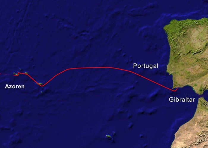 In Lajes (Insel Flores) angekommen war die Erleichterung ob der gelungenen Überfahrt groß. Dazu herrschte auch bei den anderen Crews gute Stimmung nach überstandener Großetappe. Gemeinsam mit Melanie und Frederic von Arwen, die zeitgleich mit uns von Bermuda ausgelaufen waren und einige Stunden nach uns angekommen waren, ließen wir uns vom Taxi zum See hinauf bringen und wanderten gut drei Stunden lang zurück hinunter zum Hafen. Zwei Tage später hatte ich dann verständlicherweise einen bemerkenswerten Muskelkater in den Wadeln. Ungefähr 30 Segler versammelten sich dann abends am Strand zu einer netten Runde mit Drinks und Grill. Ein Tag später zog ein Tiefdruckgebiet knapp nördlich der Insel hinweg und brachte Sturmwinde bis zu 45 Knoten, von denen wir im sicheren Hafen kaum etwas bemerkten. In dieser Nacht kamen noch zwei andere Boote an. Eines davon, ein argentinischer Einhandsegler, hatte ein paar Meilen vor der Insel eine Leine in den Propeller bekommen und musste vom örtlichen Rettungsdienst gegen Mitternacht in den Hafen geschleppt werden. Wegen Wind uns Seegang hatten die Rettungskräfte sogar in Erwägung gezogen, den Mann zu bergen und das Schiff seinem Schicksal zu überlassen. Der Mann und sein Schiff sahen gezeichnet aus. So nahe liegen hier jedenfalls Freude und Erleichterung neben Angst und Gefahr. Ich lernte hier auch die bemerkens- und liebenswerte Schweizer Familie Schwörer kennen, die auf ihrem 15m langen Aluminiumschiff Pachamama mit mittlerweile fünf Kindern (und in ein paar Wochen mit einem sechsten!) seit vielen Jahren in Sachen Umwelterziehung und Klimaschutz ( www.toptotop.org) auf den Weltmeeren unterwegs sind. Um günstige Winde für die 135 Meilen nach Horta nützen zu können, liefen wir nach zweieinhalb erholsamen Tagen in Lajes am Tag nach dem Sturm Richtung Horta aus. Eindrucksvolle, lang gezogene 4-5m hohe Restwellen schoben uns immer wieder kräftig an. Das Meer war jedoch noch sehr unruhig, aber höchstens ungemütlich und nicht gefährlich. So machten wir am darauffolgenden Abend im berühmten, aber (vor allem im Vergleich zu 2004) völlig überfüllten Hafen von Horta auf der Insel Fajal an einer französischen Yacht längseits fest. Am nächsten Tag bekamen wir wieder einmal Dank der geringen Bootsgröße einen guten Liegeplatz im ruhigen inneren Becken an einem Fingerpontoon. Herbert verließ das Schiff und verbrachte noch ein paar Tage auf Horta mit Ausflügen und Amateurfunkversuchen. Es hatte sich natürlich wieder einmal eine kleine Liste mit Servicearbeiten angesammelt. Neben dem Abarbeiten dieser Tasks gab es auch einige Wiedersehen mit anderen Seglern. Viel Zeit verbrachte ich mit der vierköpfigen Crew der französischen Yacht Dremmwel (Abendessen, Radtour, Musikabend, etc.), mit denen ich dann auch einige Tage später auf Sao Jorge mit dem Leihwagen, mittlerweile zu siebent, diese herrliche Insel erkundete. Von dort segelte ich dann nach einigen erholsamen Tagen 135 Meilen direkt nach Ponta Delgada auf der Insel Sao Miguel. Beim geplanten Ölwechsel und der damit verbundenen Motorkontrolle entdeckte ich eine leckende Stelle in der Druckleitung der Dieselzufuhr. Zum Glück bekam ich dort die zum Abdichten notwendigen O-Ringe und war erleichtert, dass die Reparatur so problemlos gelungen war. Das Schiff war nach nun fast einem Jahr unterwegs auf Langfahrt im Atlantik insgesamt recht gut beieinander, wenngleich dafür permanente Kontrolle und Wartung notwendig waren. Dafür war die Anima auch in jeder Marina ein Blickfang und Anlass für zahlreiche Kontakte mit interessierten Seglern, die nicht nur die geringe Größe, sondern auch das besondere traditionelle Design und den einwandfreien Zustand des Schiffes bewunderten. Die Anima war jedenfalls bereit für die letzte lange Überfahrt nach Südportugal, auf der mich meine Schulfreunde Wolfi und Johannes begleiteten. Sie waren auch im Jahr 2003 bei der ersten Atlantiküberquerung nach Barbados mit dabei. Nach ihrer Ankunft in Ponta Delgada fuhren wir noch 2 Tage mit dem Mietauto quer über die Insel. Dann legten wir am Montag, dem 26.6. bei halbwegs brauchbaren Windprognosen Richtung Europa ab. Dass diese 820 Meilen nach Lagos an der Algarve (900 gefahrene Meilen) wegen äußerst schwieriger Windbedingungen die ungemütlichste und gefühlt längste Passage dieser Reise werden würde, hatte ich nicht erwartet. Wie man an der Kurslinie sieht, mussten wir zuerst nach Nord halten um die für später angesagten stärkeren Nordostwinde in besserem Winkel absegeln zu können. Die Strategie war wohl die richtige, dafür ließ am letzten Tag der sonst so stete "Portugiesische Norder" aus und wir kamen gegen zwei Uhr nachts zum Cabo Sao Vicente. Für die letzten 20 Meilen war aus mehreren Quellen starker Gegenwind prognostiziert, sodass wir mit einem äußert mulmigen Gefühl, aber immerhin bei Flaute das eindrucksvolle Kap im Schein des untergehenden Mondes rundeten, allzeit bereit nun bald gegenan kämpfen oder wegen zu starker Winde bei Dunkelheit wieder umdrehen und an der ungastfreundlichen Westküste Portugals in Deckung gehen zu müssen. Entgegen aller Erwartungen und Befürchtungen ließ uns der Ostwind gerade noch genug Zeit um gegen sieben Uhr morgens sicher und erleichtert nach Lagos zu gelangen. Dafür blies er circa eine Stunde nach unserer Ankunft bereits kräftigst. Das war uns zu diesem Zeitpunkt jedoch herzlich egal und wir saßen frisch geduscht und entspannt beim wohlverdienten Frühstück. Außer einem durch Wassereintritt defekten Ladegerät und einer während der letzten drei Tage verstopften Bordtoilette - alles bereits im Austausch bzw. Reparatur - waren nach diesen acht harten Tagen keine bleibenden Schäden an Schiff oder Crew auszumachen. Die Anima ist nach ca. 7400 Seemeilen auf dem Atlantik wohlbehalten wieder nach Europa zurückgekehrt und hat sich für ein derart kleines Boot hinsichtlich Seetüchtigkeit, Langfahrttauglichkeit, Bequemlichkeit und Geschwindigkei